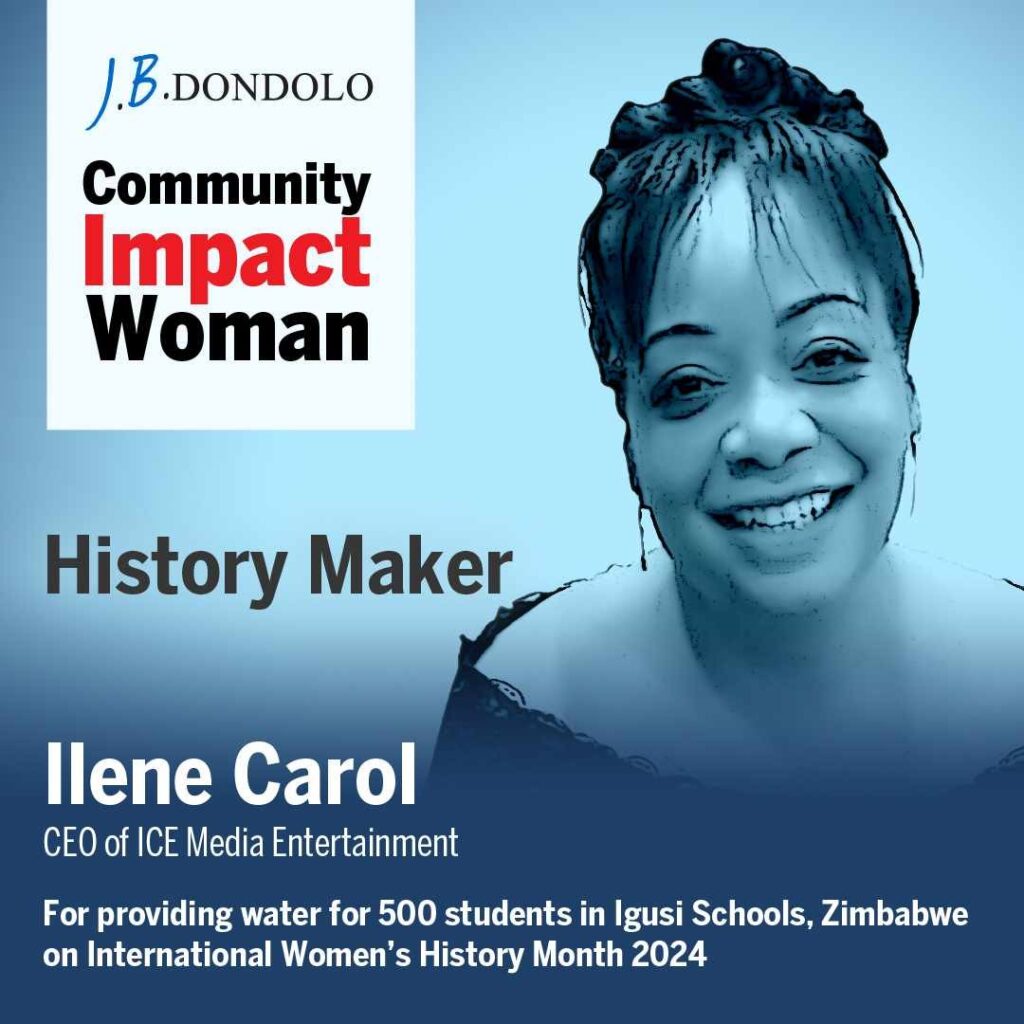 Ilene Carol was honored as a Community Impact Woman during International Women’s Month by JB Dondolo, a nonprofit organization dedicated to education and community development. The recognition highlighted her contribution toward providing clean water access for over 500 students in Igusi, Zimbabwe — a meaningful milestone in global advocacy and impact.